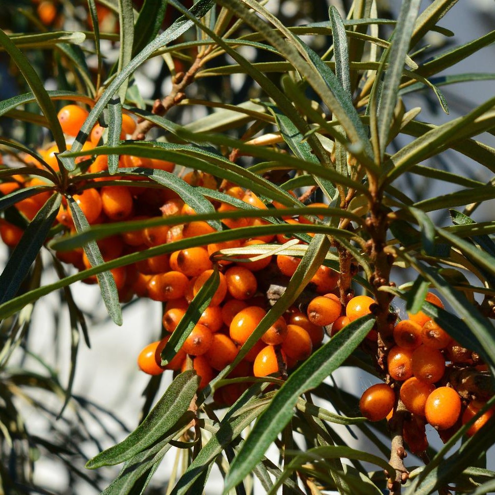 Sea buckthorn berries are striking bright orange fruits that grow in dense clusters along the thorny branches of the sea buckthorn shrub.