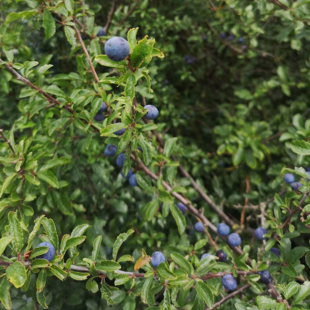 Sloe berries, or sloes, are the small, dark purple fruits of the blackthorn shrub, which is easily identified by its thorny branches, small oval leaves, and white blossom in early spring.